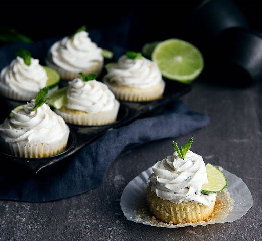 Transfer frosting into a piping bag fitted with a large star tip. Frost cupcakes, then top with small mint leaves and a lime wedge!
