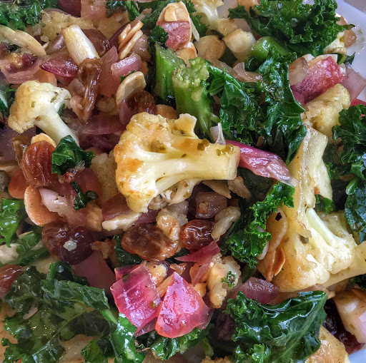In the pan used to pickle the onion and raisins, heat 2 teaspoons of olive oil on medium-high until hot. Add the cauliflower; season with salt and pepper. Cook, stirring occasionally, 8 to 10 minutes, or until lightly browned. Add the garlic, capers and mustard greens; season with salt and pepper. Cook, stirring occasionally, 1 to 2 minutes, or until the mustard greens have wilted. Transfer to the bowl of toasted almonds. Wipe out the pan.