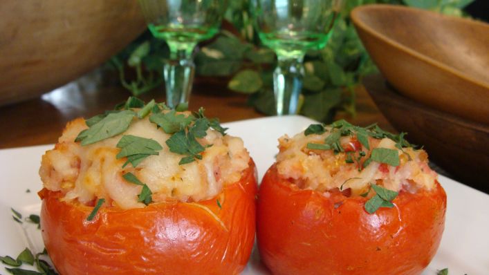 Halve tomatoes and scoop out insides leaving 1/2-inch thick shell.