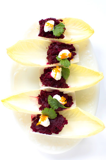 Heat oven to 400°. Place beets, olive oil, salt, and pepper in a 8" square baking dish and cover with foil; cook until tender, 1–1½ hours. When cool enough to handle, peel and roughly chop. Transfer to a food processor; pulse until finely chopped, but not pureed. Transfer to a bowl; stir in vinegar, half the orange zest, salt, and pepper. Serve on endive leaves with a dollop of yogurt, cilantro leaves, and remaining zest.