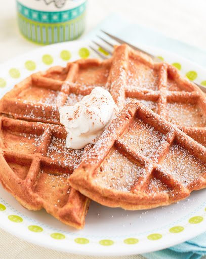 Lightly spray Belgian waffle iron with cooking spray and spoon 3/4 cup batter into center, spreading batter to the edges. Cook 4 to 5 minutes or until the steaming stops and waffles are golden brown. Dollop each serving with 2 tablespoons yogurt. Sprinkle evenly with powdered sugar and ground cinnamon. Serve immediately.