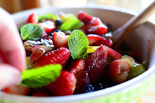 Strawberries, blueberries and grapes tossed with homemade Orange Vanilla syrup and topped with fresh mint leaves make an extra-refreshing fruit salad.