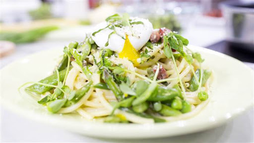 Cook pancetta in a large nonstick skillet over medium heat until it is crispy and rendered, about 5-7 minutes. Then transfer to a papertowl-lined plate to drain. Leave 1 tablespoon of drippings in pan. Add asparagus to that same skillet and sauté for 3-4 minutes. Add peas, spring onions, garlic and sauté until vegetables are tender.