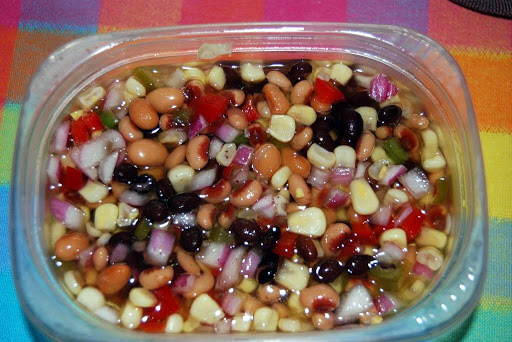 Boil: all dressing ingredients, let cool and pour over veggies in bowl.