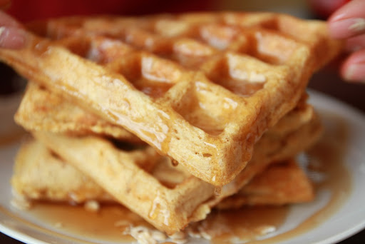 I have a few waffle recipes in the cookbook, but here is another version that I've been using in my kitchen. This recipe helps me to feed my starter on time. Sometimes I'm just not ready to bake bread with starter that is ready to be used and fed- and I hate to pour any of it down the drain. This way I can whip breakfast up quick, feed my starter, and keep everything in working order. Oh, and did I mention they are fat free, sugar free, and made in your blender?