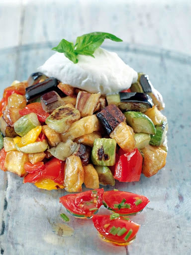 Take all of the fried ingredients in a large deep bowl, crush the garlic cloves fried in the machine in 250g yogurt and add this mixture onto them. Prepare first the fried vegetables and yogurt mixture, then pour the sauce prepared with tomatoes on them. You may decorate the salad with chopped parsley.