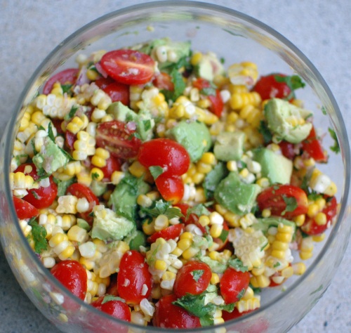 Combine the corn, avocado, tomatoes and onion in a large glass bowl. Mix together the dressing ingredients in another bowl, pour over the salad, and gently toss to mix.