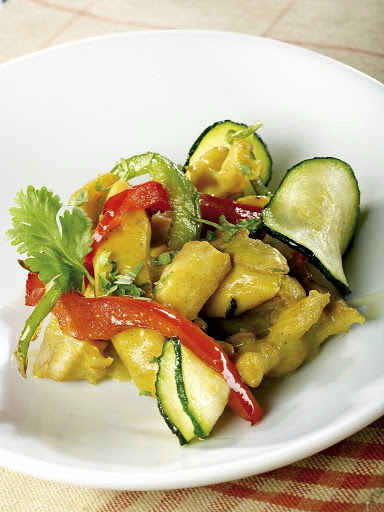 Place the chicken strips, gingerroot, salt, pepper, chilli pepper and garlic in the ActiFry pan. Drizzle evenly with half of the oil. Cook for 8 minutes or until browned. Transfer the chicken to a bowl; reserve. Add the peppers, courgette and remaining oil to the ActiFry pan. Cook for 5 minutes.