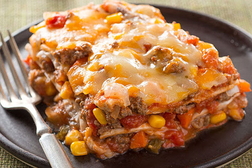 Spread 2 cups tomato mixture onto bottom of 13x9-inch baking dish; top with 4 tortilla halves, with cut-sides of tortillas facing sides of dish. Cover with layers of half the beans, 2-1/2 cups of the remaining tomato mixture and 1/2 cup cheese. Repeat layers. Top with remaining tortillas, tomato mixture and cheese; cover with sheet of foil sprayed with cooking spray.