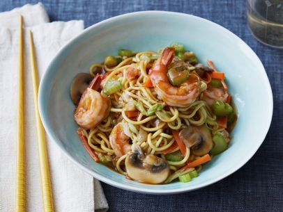 Whisk the cornstarch into 2 tablespoons cold water. Once dissolved, add to the sauce. Add the sauce to the pan with the vegetables and bring to a simmer. Toss in the reserved shrimp, aromatics and noodles and serve!