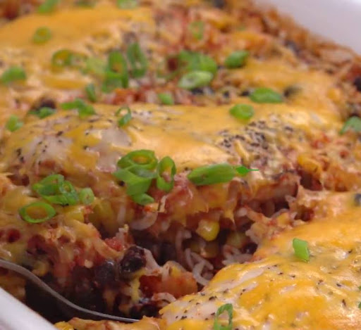 In an 8-inch-by-8-inch baking dish, add the rice, black beans, corn, salsa, chicken broth, chili powder and oregano. Stir to combine.