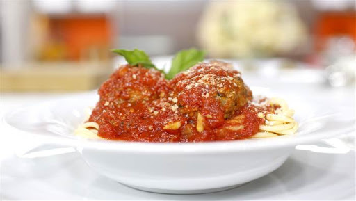 Once the spaghetti, tomato sauce and meatballs are plated, top each dish with the Parmesan cheese before serving.