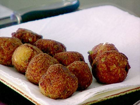 Working in batches, add the rice balls to the hot oil and cook until brown and heated through, turning them as necessary, about 4 minutes. Using a slotted spoon, transfer the rice balls to paper towels to drain. Season with salt. Let rest 2 minutes. Serve hot.
