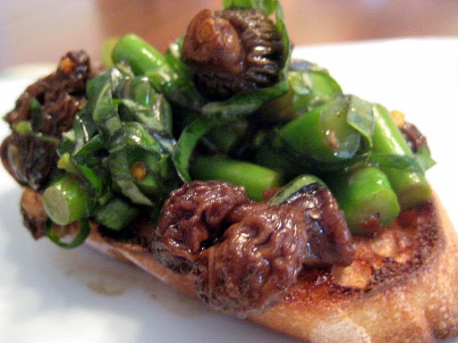 Blanch asparagus in salted boiling water for 1 minute, and shock in an ice bath until chilled. Drain and slice into 1/2" pieces. Mix asparagus with the morel mixture. Grill or toast slices of the bread and divide mixture on top of them.