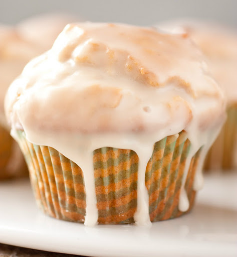 During the last few minutes of cooling prepare glaze by whisking together powdered sugar, milk and vanilla in a small bowl. Dip each muffin in glaze, while twirling and rotating to evenly coat tops (and allowing it a few seconds to get a good layer of coating on), then lift and allow excess glaze to run off. Enjoy warm or allow cupcakes to rest at room temperature about 5- 10 minutes until glaze has set. Store in an airtight container.