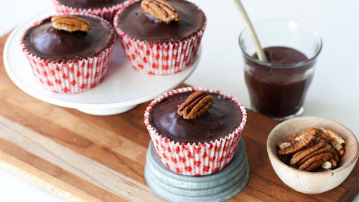 Meanwhile, make Icing. In 1-quart saucepan, heat 1/2 cup butter, 3 tablespoons baking cocoa and the milk to simmering. Remove from heat; beat in powdered sugar and 1 tablespoon bourbon. Spoon warm icing over warm cupcakes. Top with pecan halves.