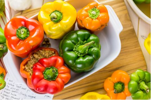 Cut the tops off of the peppers and remove the seeds and stems. Slice each pepper in half lengthwise.
