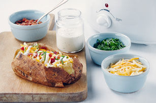 Unwrap potatoes carefully; cut slits in potatoes. Serve topped with remaining ingredients.