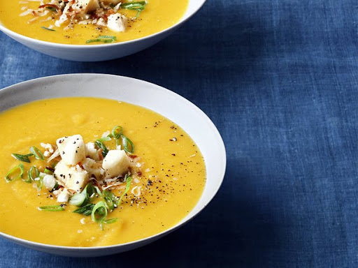 Meanwhile, heat the chicken stock to a simmer. When the vegetables are done, put them through a food mill fitted with the medium blade. (Alternatively, you can place the roasted vegetables in batches in a food processor fitted with the steel blade. Add some of the chicken stock and coarsely puree.) When all of the vegetables are processed, place them in a large pot and add enough chicken stock to make a thick soup. Add the curry powder, 1 teaspoon salt and 1/2 teaspoon pepper. Taste for seasonings to be sure there's enough salt and pepper to bring out the curry flavor. Reheat and serve hot with condiments either on the side or on top of each serving.