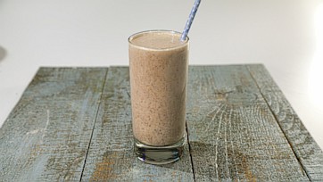 In the pitcher of a blender, add banana, peanut butter, protein powder, bittersweet chocolate, almond milk, and ice. Blend until smooth.