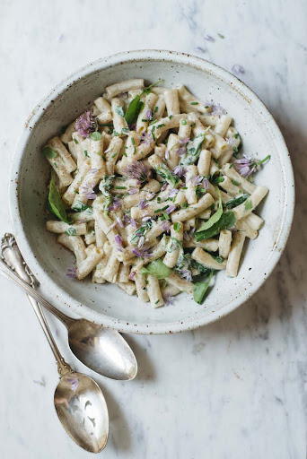 Transfer the pasta and watercress to a serving bowl; pour the sauce over the pasta and mix. Taste and adjust salt, if needed. Serve hot with remaining 1 tablespoon of chives, chive flowers, and nutmeg.