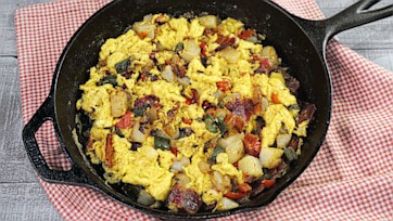 In a very large (12- or 14-inch) skillet, add the bacon and cook over medium heat until crisp, 7 to 8 minutes. Transfer to a paper towel-lined plate and crumble when cool. Transfer the bacon fat to a bowl and reserve, returning 3 tablespoons to the skillet. Add the onion and both peppers and cook over medium-high heat, stirring occasionally, until the onion is browned and the peppers are softened, 11 to 12 minutes. In a separate skillet, add reserved bacon fat and potatoes. Place over medium-high heat and cook, stirring occasionally, until golden-brown. Add the browned potatoes to the skillet with the pepper mixture and toss to combine. Push the mixture to one side of the skillet, add another tablespoon of bacon fat, and scramble the eggs until cooked. Add the bacon to the pan, stir together the entire mixture, season with salt and pepper, and serve immediately.