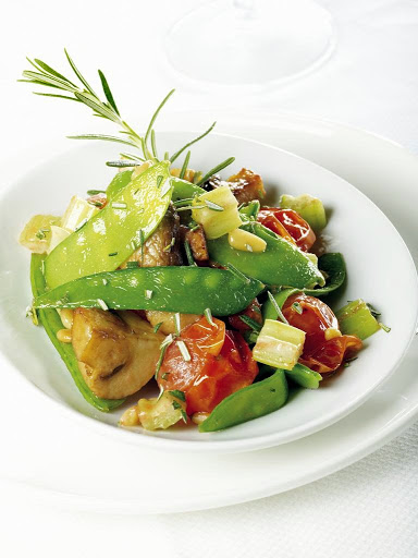 Cut the celery stalks into pieces and the muschrooms in half. Pour the oil in the ActiFry and add the mange-touts, the cherry tomatoes, the celery and the mushrooms. Sprinkle with finely chopped rosemary.