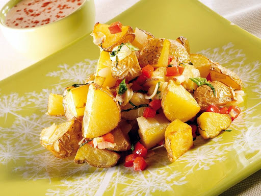 Fried Potato Chunks with Onion and Peppers (+ Cocktail Sauce)