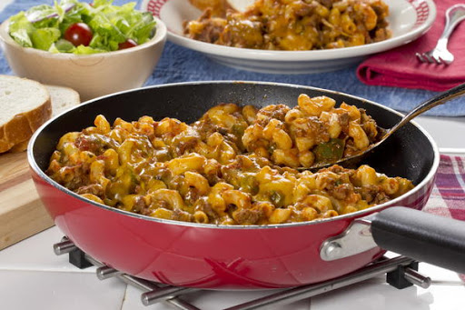 In a large skillet over high heat, brown the ground beef, bell pepper, and onion 6 to 8 minutes, or until no pink remains in the beef, stirring frequently. Drain off excess liquid.