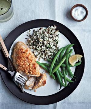 Sprinkle any remaining cracker mixture on the chicken and drizzle with any remaining butter. Bake until the chicken is golden brown and cooked through, 25 to 30 minutes. Serve with the pilaf and green beans, if using.