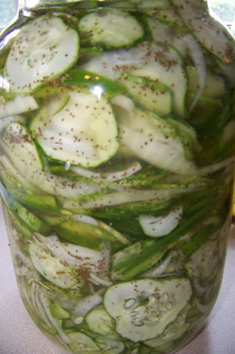 Slice the veggies into 2 quart jars, I like to make layers of them: you can leave out the onions and peppers, if you want, but they are so good!~Mix your other ingredients in a large measuring cup, stir well. The sugar will not be dissolved yet~Pour over sliced vegetables, evenly in each jar~You will finish filling the jars with cold tap water~I shake the jar a few times during the 24 hrs to mix~No need to cook it~ Ready to eat in 24 hours. Taste best if eaten within a week or two~but I like to add tomato wedges or slices to this liquid for overnight, when it is close to empty of veggies~Use the next day~Unbelievable with sandwiches~