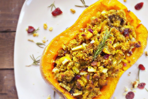 Heat all diced veggies, fruit and nuts in a skillet over medium heat for about 5 minutes to bring out some flavor and juices (they will cook through in the oven)