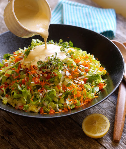 1) Combine all of the ingredients in a high-speed blender, and blend until completely smooth. Serve over your favorite salad ingredients, including sliced red pepper, shredded cabbage or romaine, fresh cilantro, and some sunflower seeds for crunch.