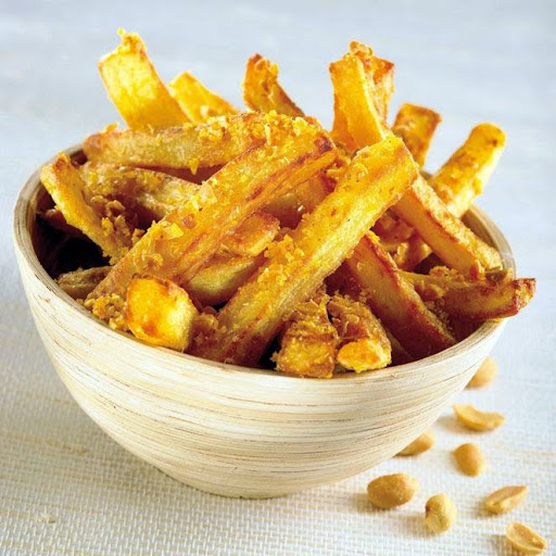 Peel the potatoes and cut chips of equal thickness, each about 1/2 inch (1 cm)square thickness. Rinse thoroughly in water; drain well. Use a clean tea towel to thoroughly dry the potatoes.
