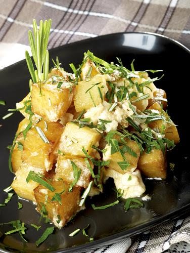 Cut the potatoes into cubes and cook for 30 minutes in the ActiFry with the crushed garlic and the olive oil.