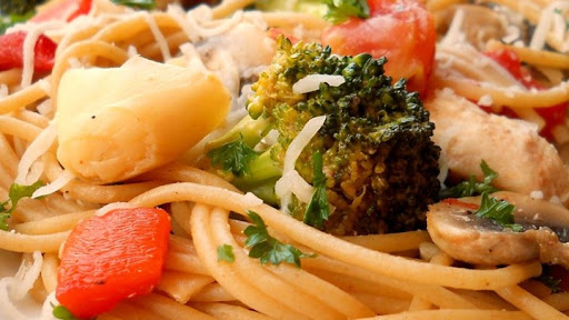 Pour the chicken broth into the pan; then add the broccoli and tomato, and cook for about 5 minutes. Stir in the artichoke hearts, mushrooms, red bell pepper, cooked chicken, and pasta; cook for 3 to 5 more minutes, or until hot. Season to taste with salt and pepper.