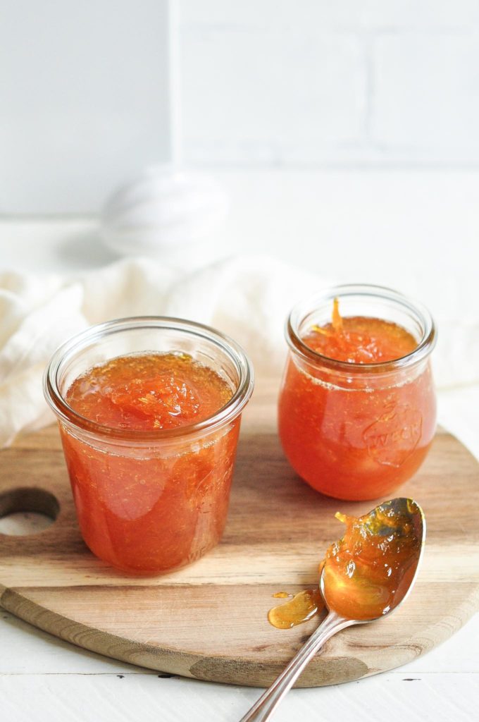 4. Add the blanched rinds, the juice, 2 cups of water, sugar, ginger, lemon juice, and the vanilla bean to a large non-reactive pot. Bring the marmalade mixture to a boil over high heat and cook until the temperature reaches 223F - about 30-45 minutes. Scrape the bottom of the pan occasionally as the mixture cooks to keep it from scorching. If you find that the mixture is starting to stick reduce the heat and keep cooking until the appropriate temperature is reached.
