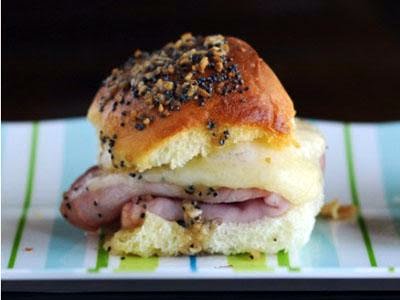 Put ham and cheese in between sliced rolls. Mix all other ingredients and spoon over sandwiches. Let set overnight or several hours.