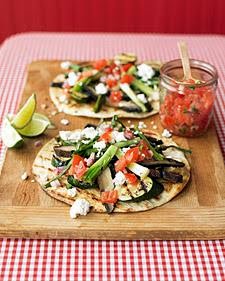 Brush tortillas with remaining tablespoon oil; grill, turning frequently, until browned and very crispy, about 2 minutes. Place 1 tortilla on each serving plate; cover evenly with mushrooms and zucchini. Using kitchen shears, snip scallions over vegetables. Top with salsa, and sprinkle with feta; serve with lime wedges, if desired.