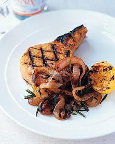 Season pork chops with salt and pepper, and coat with flour, shaking off excess. Grill chops on the hottest part of the grill, flipping once, until marked, 1 to 2 minutes per side. Move chops to edge of grill, and cover. Cook, flipping once, until a meat thermometer registers 145 degrees for medium, about 2 minutes per side. Transfer to a plate. Let stand, covered, 10 minutes. Serve with remaining lemons and onion mixture.