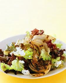 Meanwhile, in a large bowl, whisk together lemon juice and remaining 3 tablespoons oil; season with salt and pepper. Add greens, and toss to coat. Serve topped with onion and cheese.