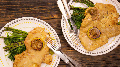 Top the pork cutlets with lemon slices and sauce. Serve with wilted spinach or grilled asparagus alongside.
