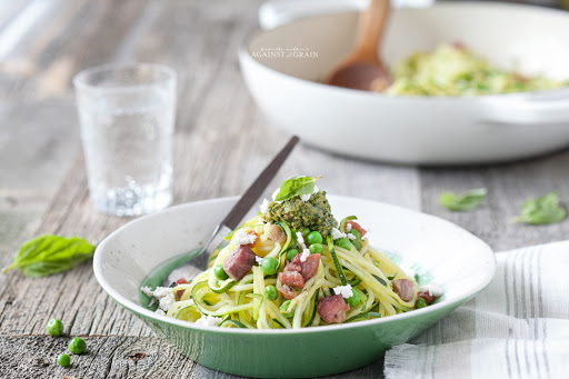 Add the zucchini noodles and sauté for 5 minutes, until crisp-tender. Stir in the pesto sauce and season with salt and pepper. Remove from heat and stir in the thawed peas.
