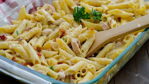 3. In large bowl, combine drained cooked pasta, 1 lb boneless skinless chicken breasts, cooked, chopped, 1 jar (15 oz) Alfredo sauce, 3 tablespoons chopped cooked bacon, 1 egg and 1 teaspoon pepper; stir gently to combine. Pour mixture in baking dish.
