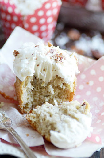 Spread frosting on top of cooled cupcakes and garnish with additional pecans and coconut.