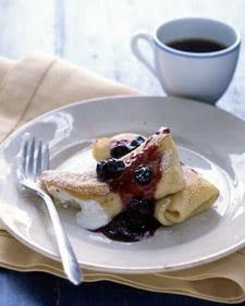 These paper-thin crepes can be filled with just about anything. For this rendition, a handful of blueberries is blended into a velvety mixture that's spooned into golden, delicate pancakes. Serve them after dinner or even at brunch -- more proof that blintzes can be enjoyed many ways. When forming blintzes, be careful not to overfill each crepe. That way, the creamy mixture is less apt to seep out as you fry the blintzes, making for a neater presentation.
