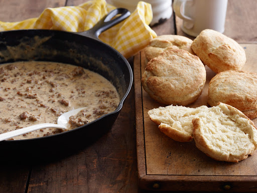 In a large cast iron skillet, cook sausage, bacon, onion and garlic over medium-high heat until sausage is browned and crumbly; 8 - 10 minutes. Stir in flour, and cook, stirring frequently, for 3 minutes. Gradually stir in half-and-half, pepper, and salt, and cook until gravy is thickened, about 5 minutes. Serve immediatley with biscuits.