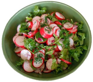 Toss radishes with salt and let stand 10 minutes. Drain off any liquid and transfer radishes to a large bowl. Add red onions and greens.