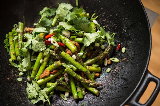 Set a wok over high heat and add vegetable oil. When oil is hot, add asparagus and season lightly with salt. Stir-fry for a minute or so, then add Sichuan pepper, five-spice powder, garlic, ginger, sugar, chiles, soy sauce and walnuts. Continue cooking over high heat for 1 to 2 minutes, tossing to coat well, until asparagus is cooked but still firm and bright green. (It will continue to cook a bit off the heat.)