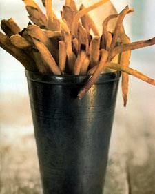 French fries are simple to make, as long as you start with a good starchy potato like Idaho or russet, clean oil, and a good amount of coarse salt. The secret of delectable fries lies in the deep-frying process. The oil needs to be just the right temperature -- if it is too cool, the potatoes will act like a sponge and absorb the oil; conversely, if the oil is too hot, the outsides of the potatoes will burn before the insides cook through.
